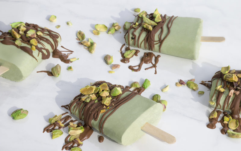 Recette de sucettes glacées au lait de coco, matcha, pistaches et chocolat au lait